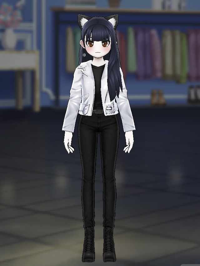 자칫 너무 어두워 보이지 않게 화이트 라이더 자켓을 입혀 코디 했습니다.