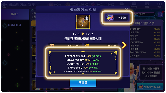■ 럽스페이스 배지와 골드를 사용해 플래닛과 페어리 테일의 레벨을 올릴 수 있어요.