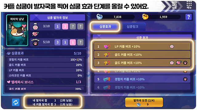 ■ 커플 심쿵 버프 화면에서 발자국 도전으로 심쿵 효과 단계를 올릴 수 있어요.
