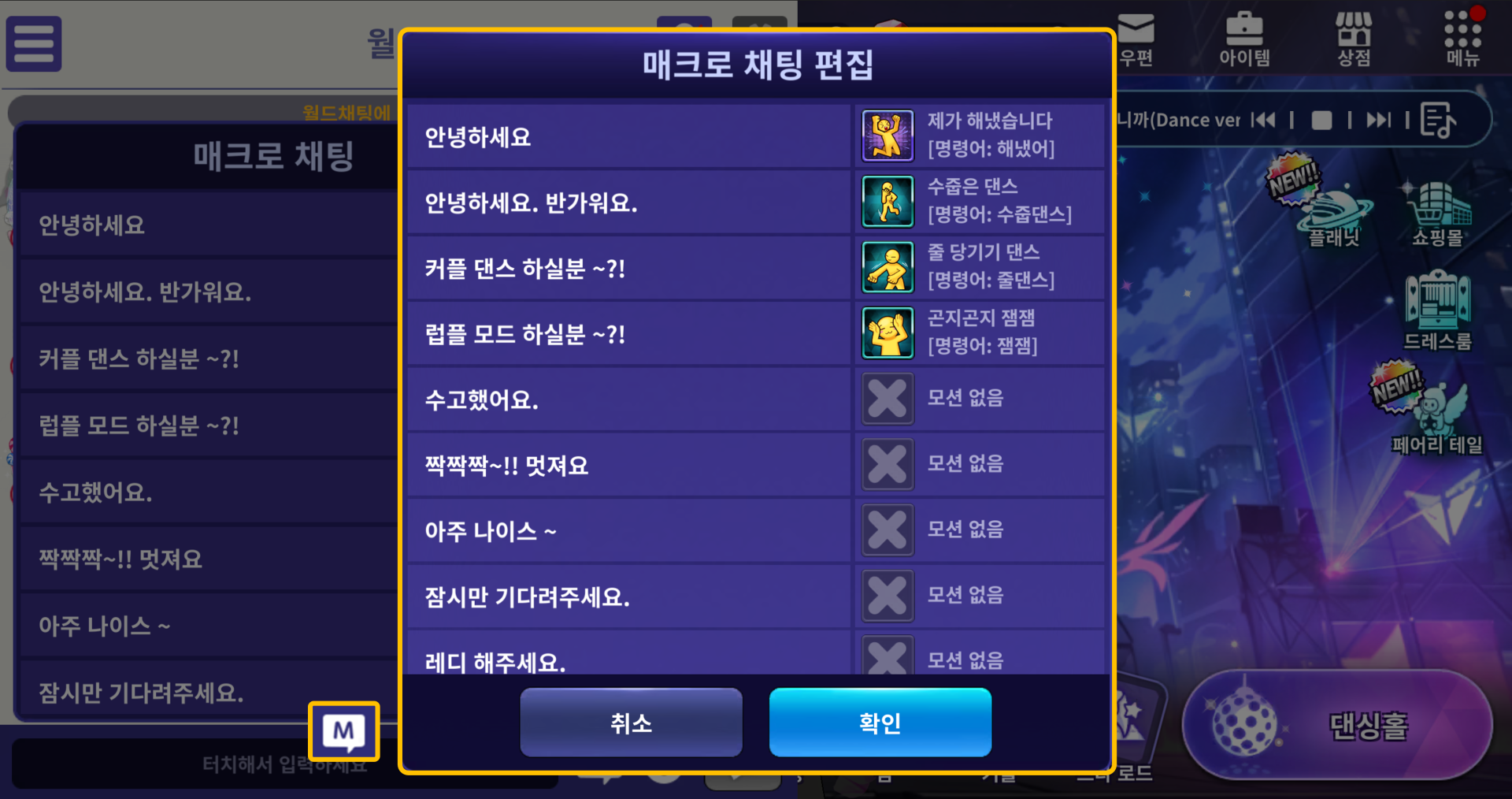 채팅을 클릭 [M] 아이콘을 클릭하면 매크로 채팅을 생성할 수 있습니다.