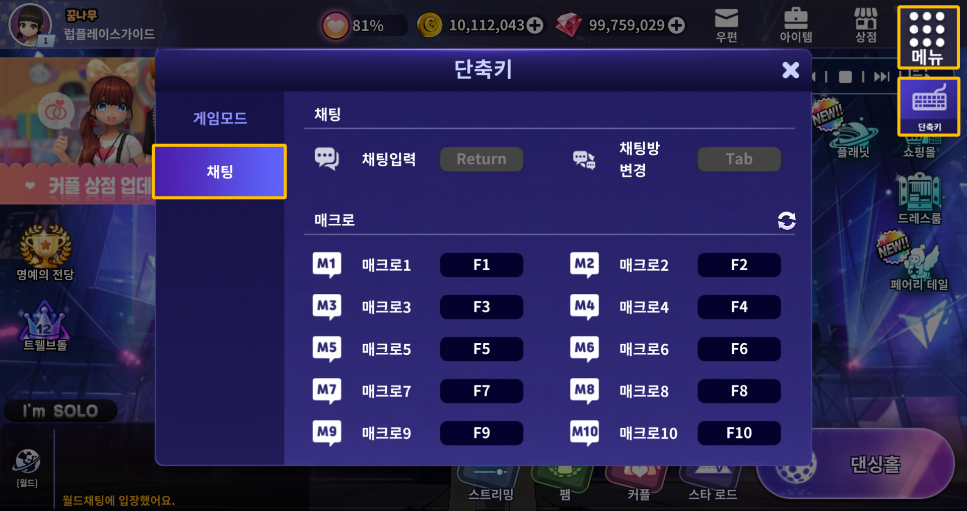 매크로 채팅의 단축키는 [메인화면] - [메뉴] - [단축키] 내 채팅을 클릭하여 변경할 수 있습니다.