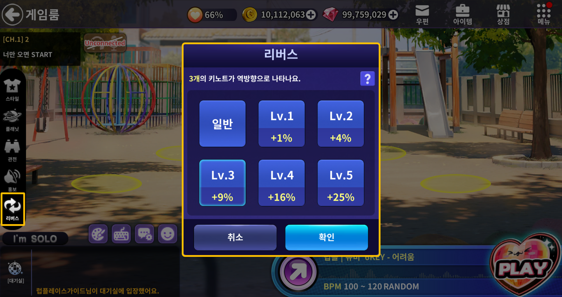 리버스 설정 레벨에 따라 등장하는 리버스 노트 개수와 보너스 점수가 달라집니다.