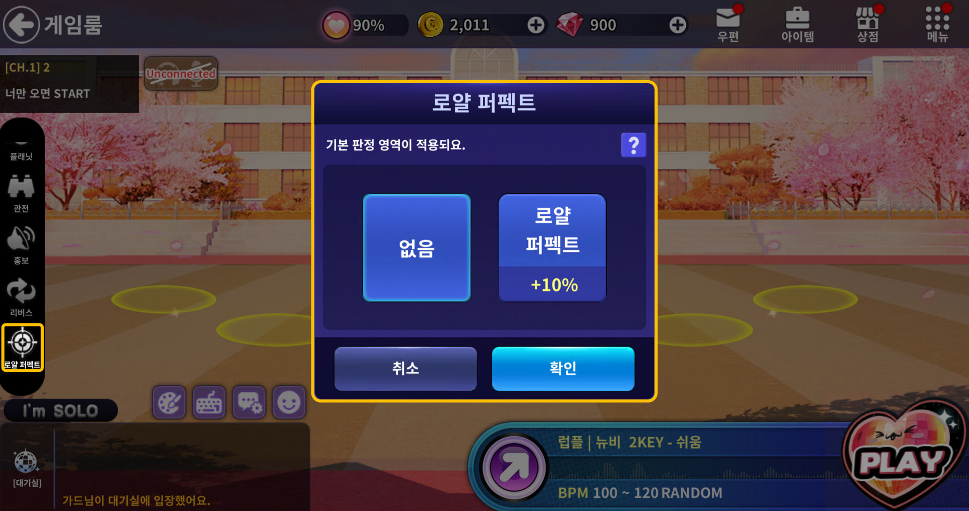 [게임룸]-[좌측 내비게이션 바 드래그]-[로얄 퍼펙트] 클릭 시 설정이 가능합니다.