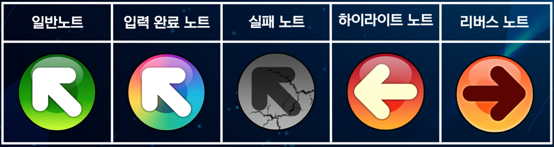 한마디 안에 등장한 방향키 노트를 왼쪽부터 차례대로 입력해야하며, 입력해야하는 노트와 다른 방향을 입력 시 해당 노트를 실패 노트로 입력됩니다.