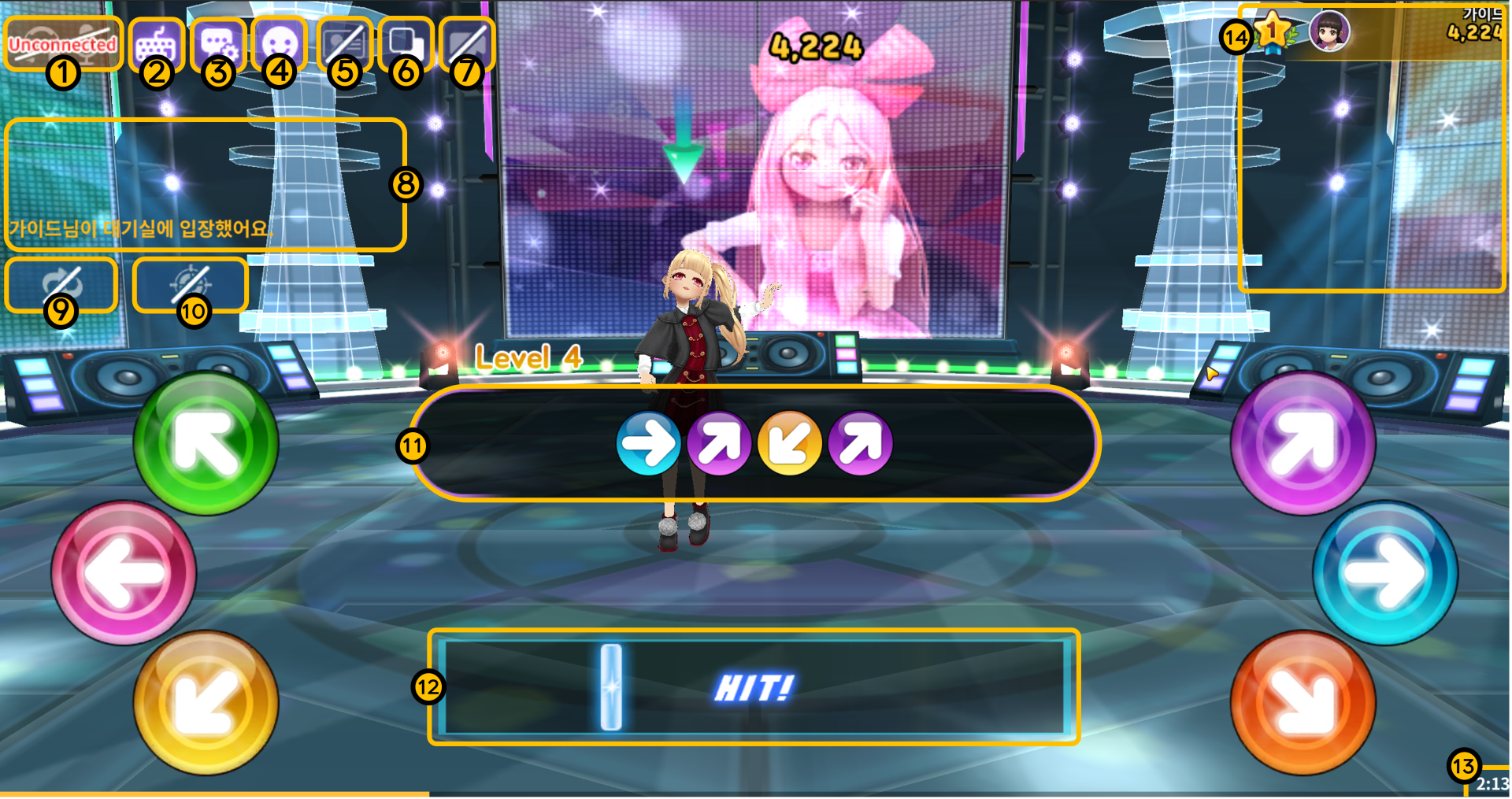 ⑪ 입력해야 하는 방향키 노트를 확인할 수 있습니다.