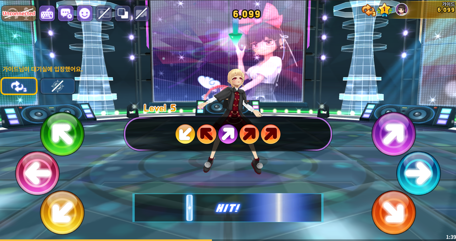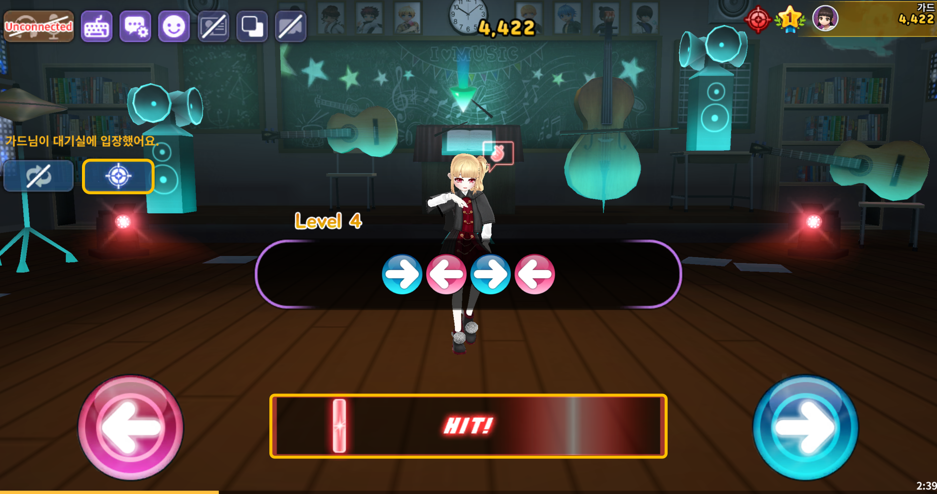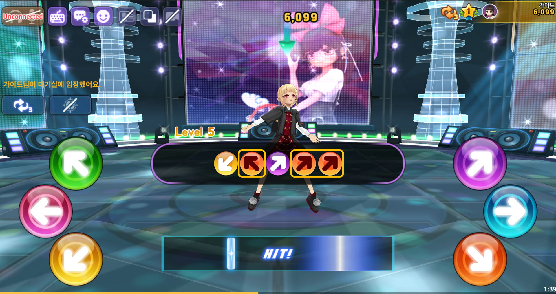 게임은 화면에 표시된 방향키 노트를 입력 후 판정을 받는 방향키 입력 모드와