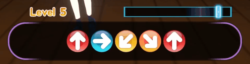 방향키를 입력 후 왼쪽에서 오른쪽으로 이동하는 판정 라인을 판정 구역에 맞춰 입력해야 최종 점수를 획득할 수 있습니다.