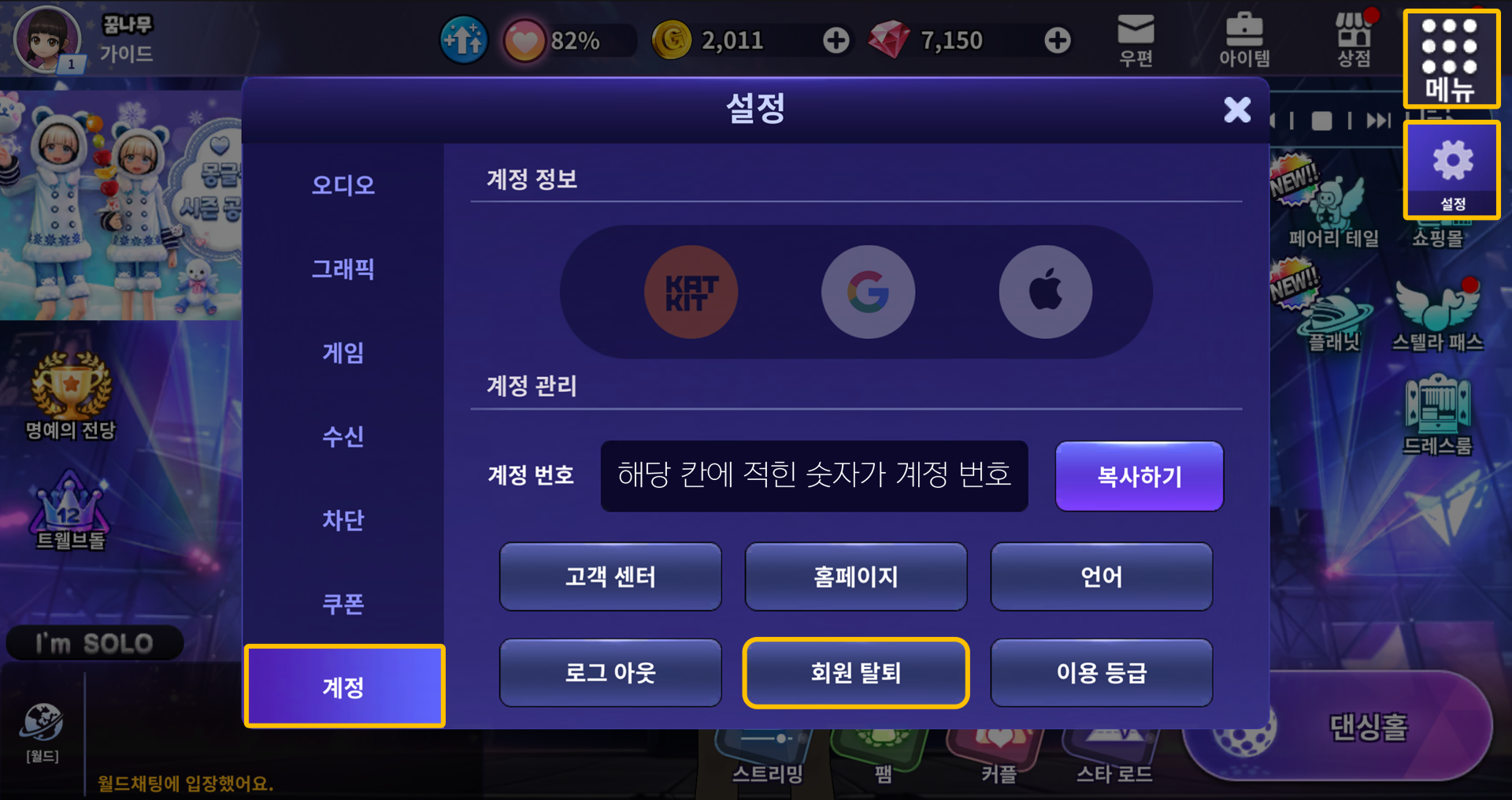 ①[메뉴] - [설정] - [계정] 선택 시 [회원 탈퇴] 버튼을 확인할 수 있습니다.