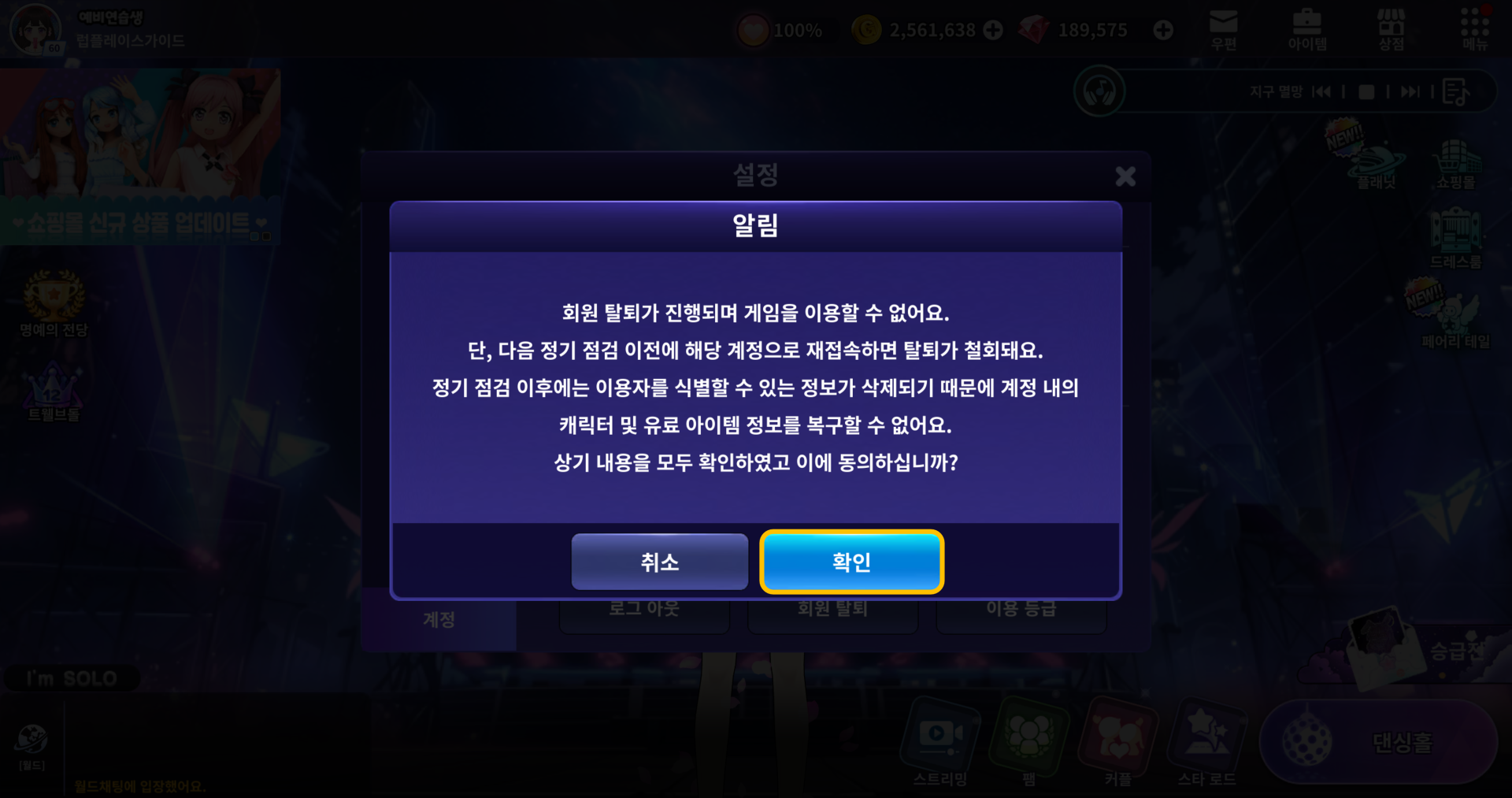 ② [회원 탈퇴] 클릭 시 탈퇴 진행 알림이 뜨며, 알림 하단의 [확인] 버튼을 누르시면 계정 탈퇴가 진행됩니다.* 계정 탈퇴는 7일 경과 시점 정기 점검 시 삭제되며, 복구되지 않습니다.* 계정 탈퇴 철회는 탈퇴를 진행한 계정으로 재 로그인 시 철회가 진행 됩니다. (단, 계정 정보가 삭제되기 전인 7일 이내에만 가능)* 캐릭터 삭제는 회원 탈퇴로만 가능합니다.