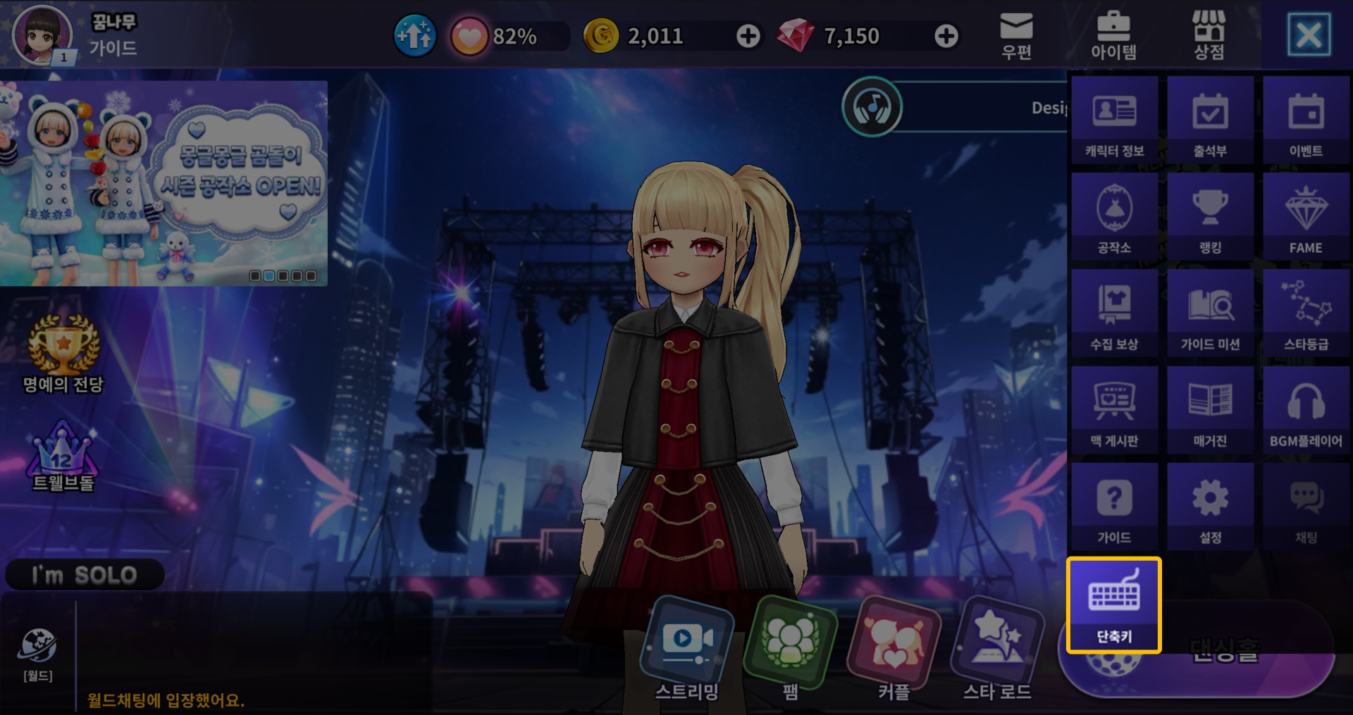 [메뉴] - [단축키] 클릭 시 게임 플레이 단축키 또는 채팅 매크로 단축키 설정이 가능합니다.
