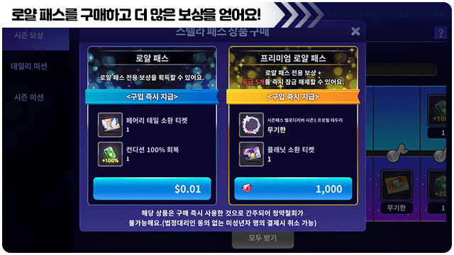 ■ 로얄 패스는 로얄 패스와 프리미엄 로얄 패스 둘 중 하나를 선택하여 구매할 수 있어요.