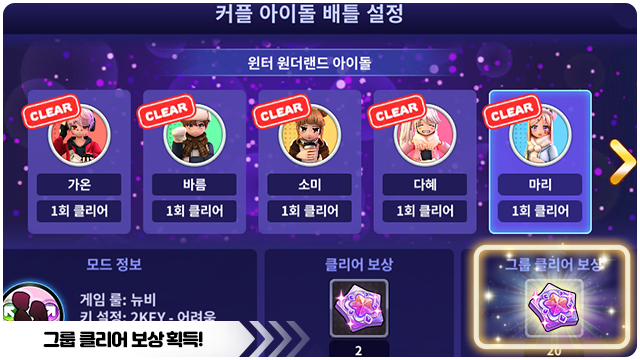 ■ 동일한 아이돌 그룹에 속한 NPC 5명을 모두 1회 이상 클리어하면 그룹 클리어 보상을 획득해요.