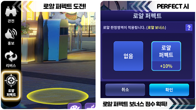 ■ 로얄 퍼펙트 적용 상태에서 PERFECT 판정 획득 시 로얄 퍼펙트 보너스 점수를 획득할 수 있어요.