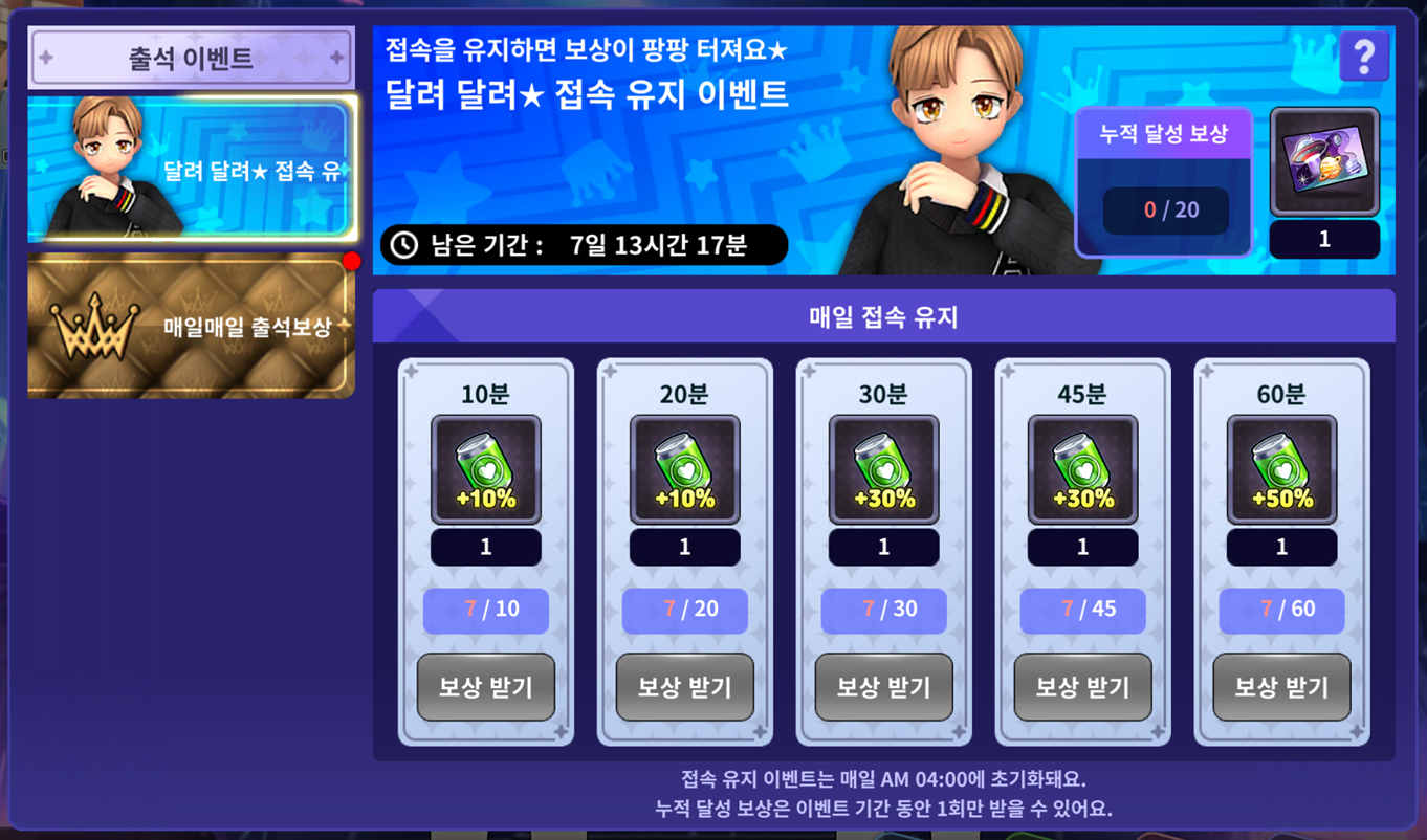 - 접속 유지 이벤트는 매일 04시를 기준으로 초기화됩니다.