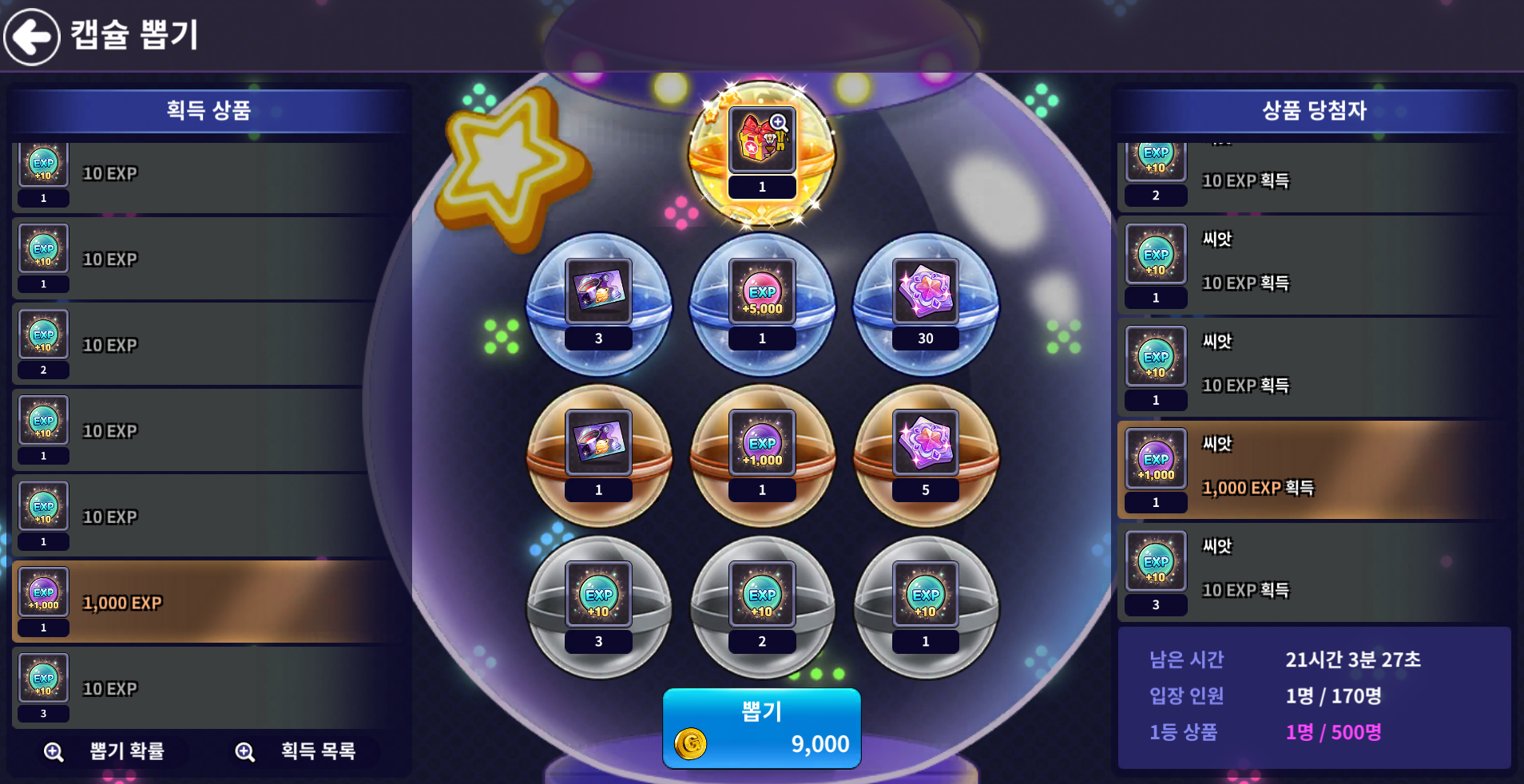 - 골드 캡슐 뽑기: 9,000 골드