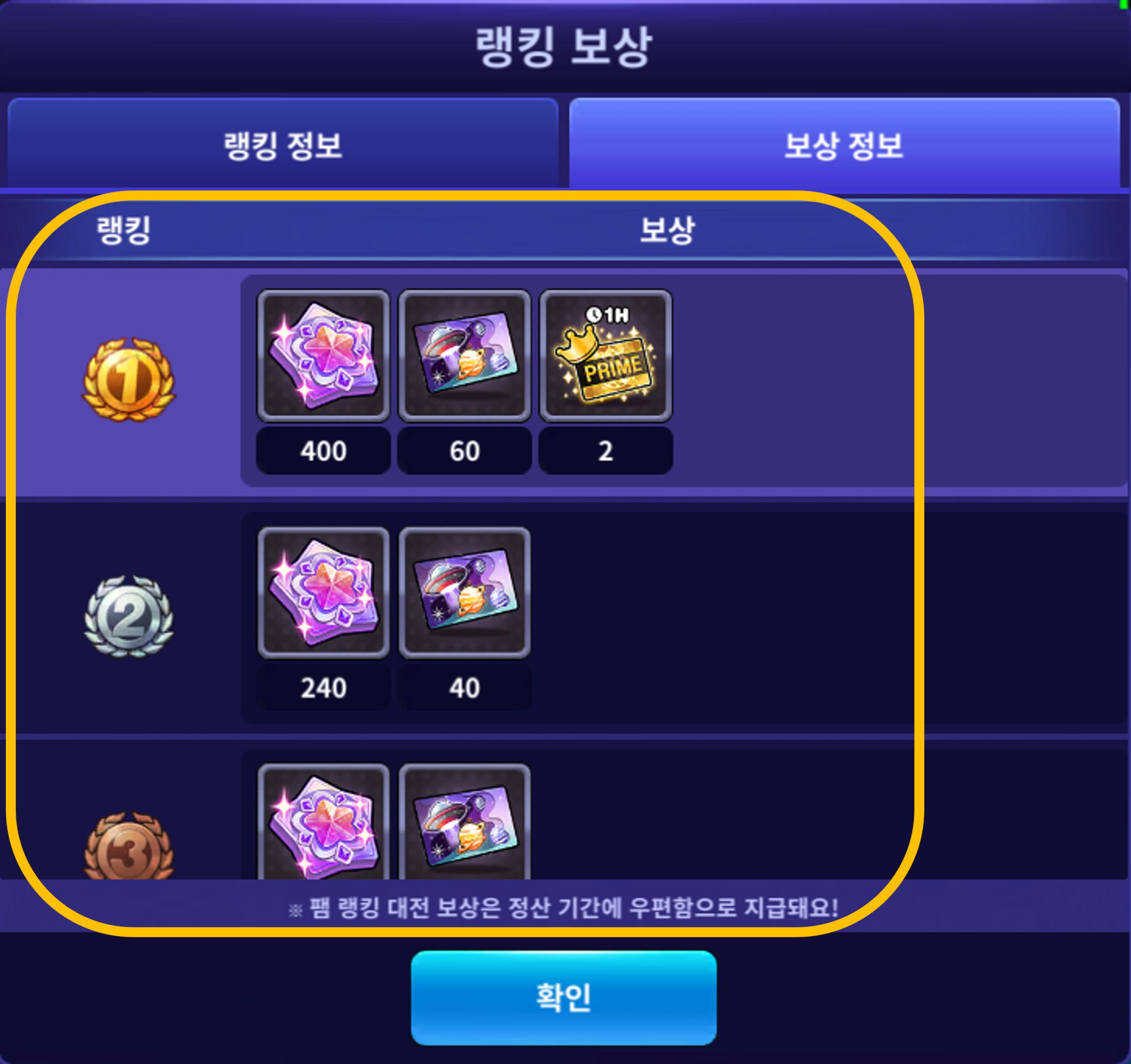 | 1위 | 셀럽코인 200개 플래닛 소환 티켓 30개 프라임룸 버프(1시간) 1개 | 셀럽코인 400개 플래닛 소환 티켓 60개 프라임룸 버프(1시간) 2개 |