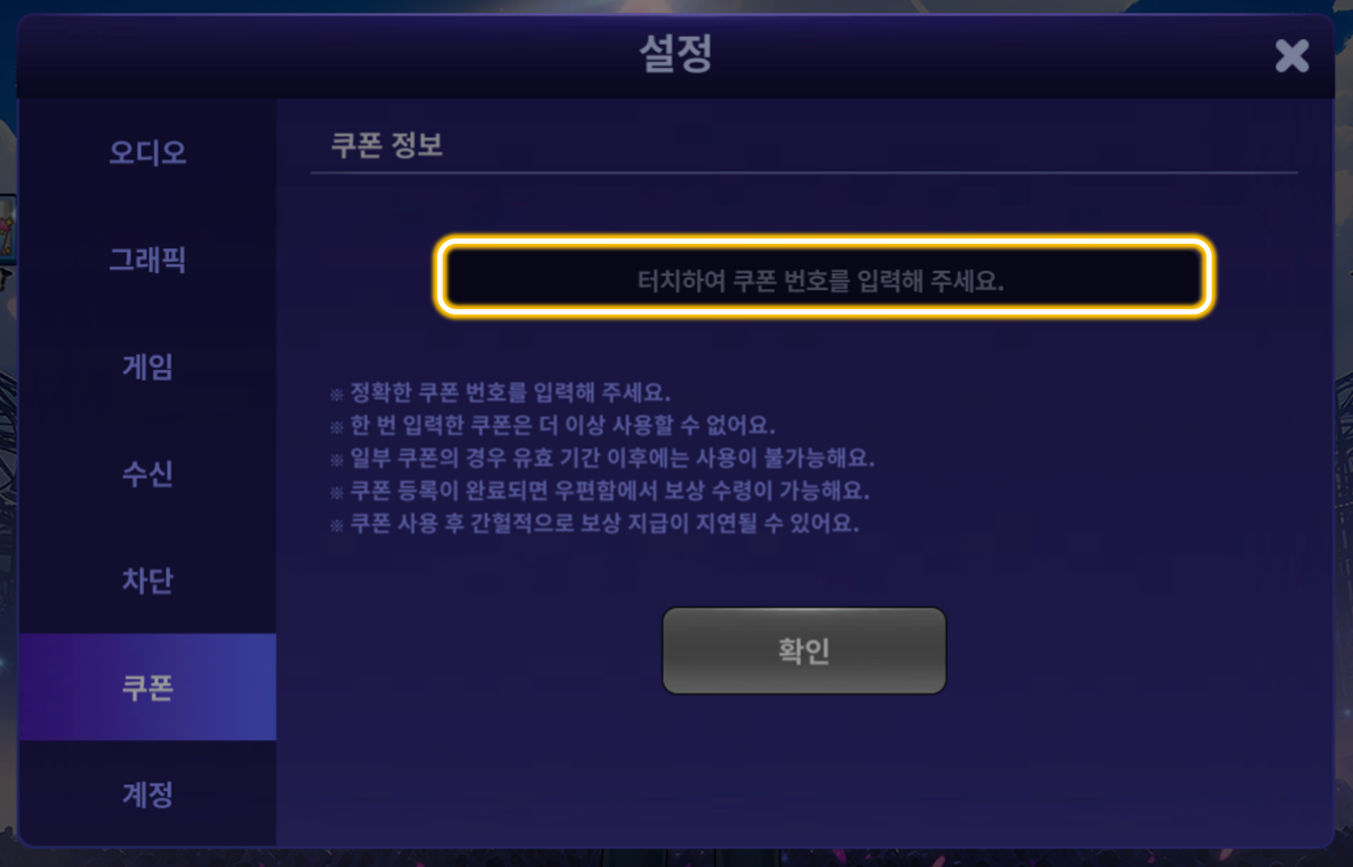 - 행운 코드 입력 시 보상이 [우편함]으로 지급됩니다.