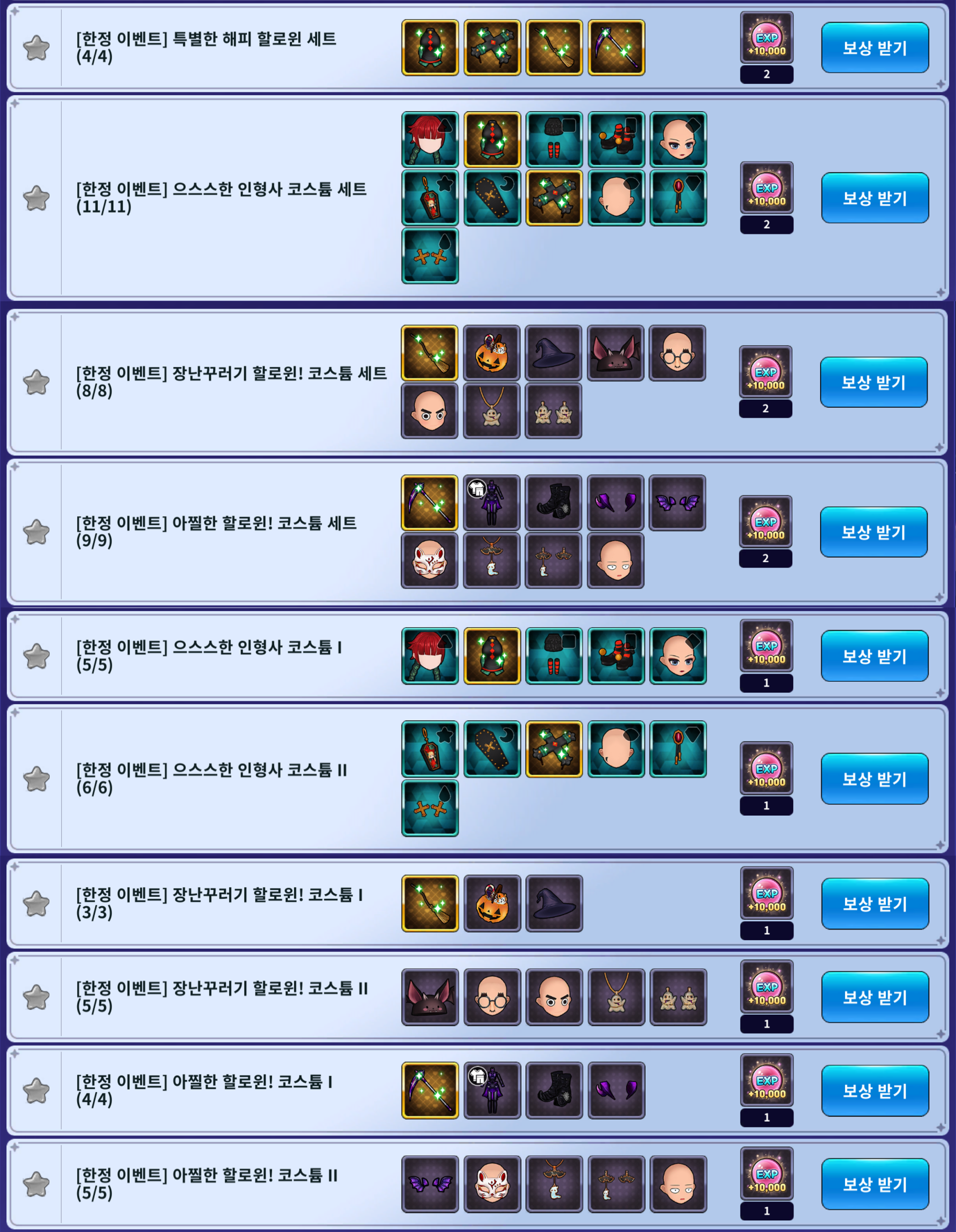 - 특별한 해피 할로윈 세트 (보상: 10,000 EXP 2개)