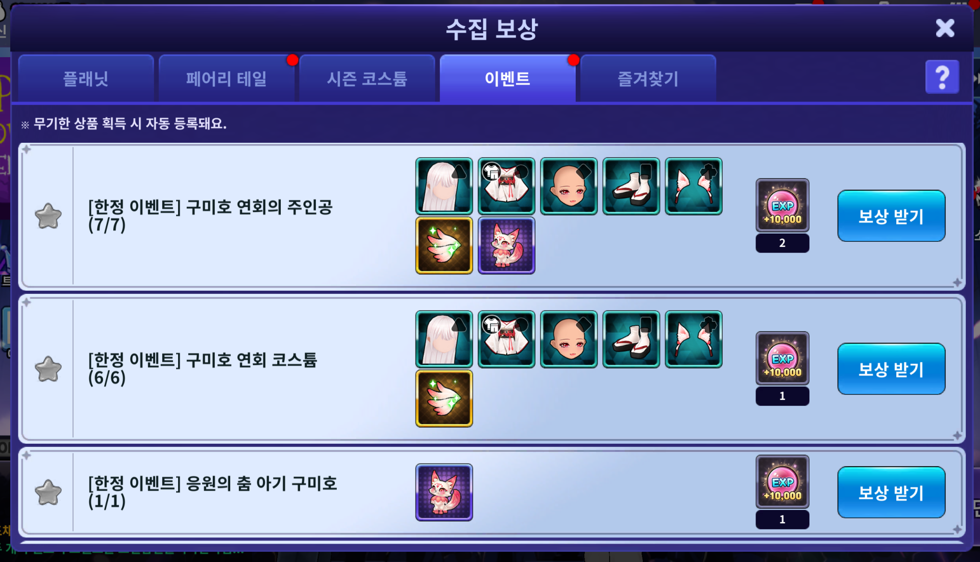 - 응원의 춤 아기 구미호 (보상: 10,000 EXP 1개)