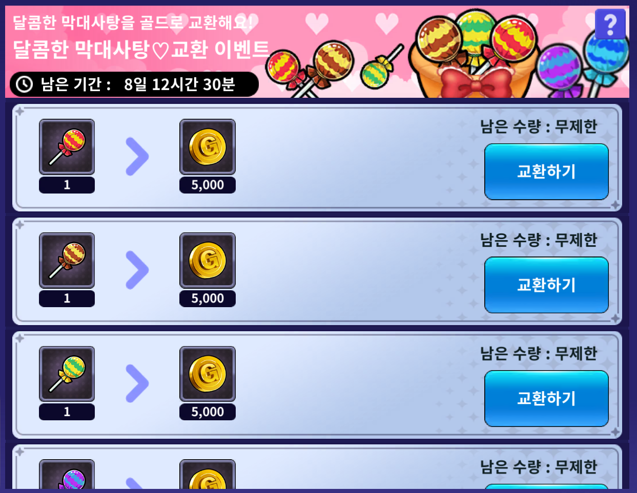 | 5,000 골드 | 딸기맛 막대사탕 1개 | 무제한 |