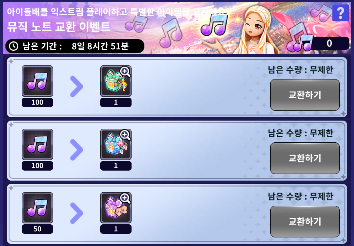 - [메뉴] - [이벤트] - [깜짝 이벤트] - [뮤직 노트 교환 이벤트]를 통해 진행할 수 있습니다.