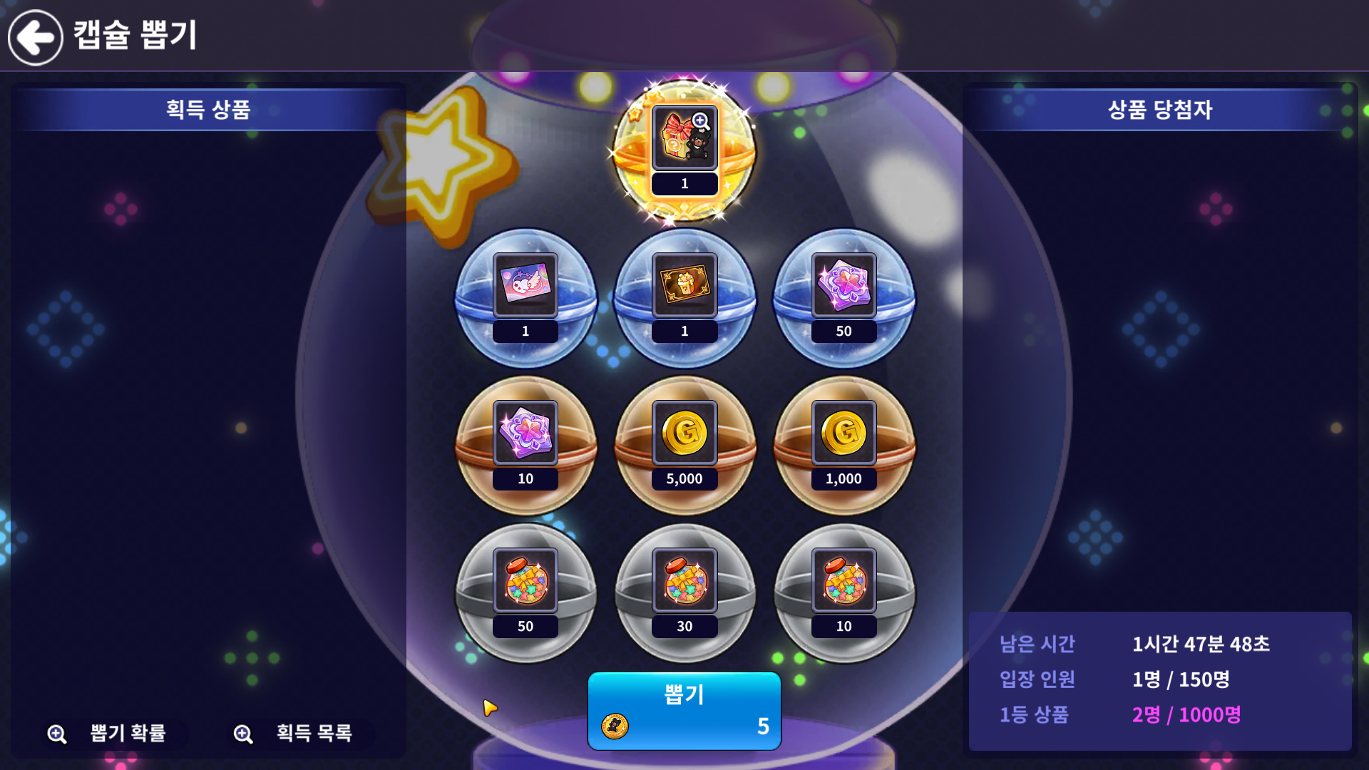- 1등 상품에 한정된 개수가 모두 소진되거나, 진행 시간이 마감될 경우 해당 캡슐 뽑기가 종료됩니다.