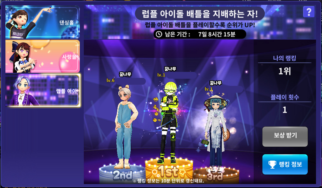 - [랭킹] 럽플 아이돌 배틀을 지배하는 자의 경우 댄싱홀:아이돌 배틀 플레이 완료 시에만 횟수에 포함됩니다.