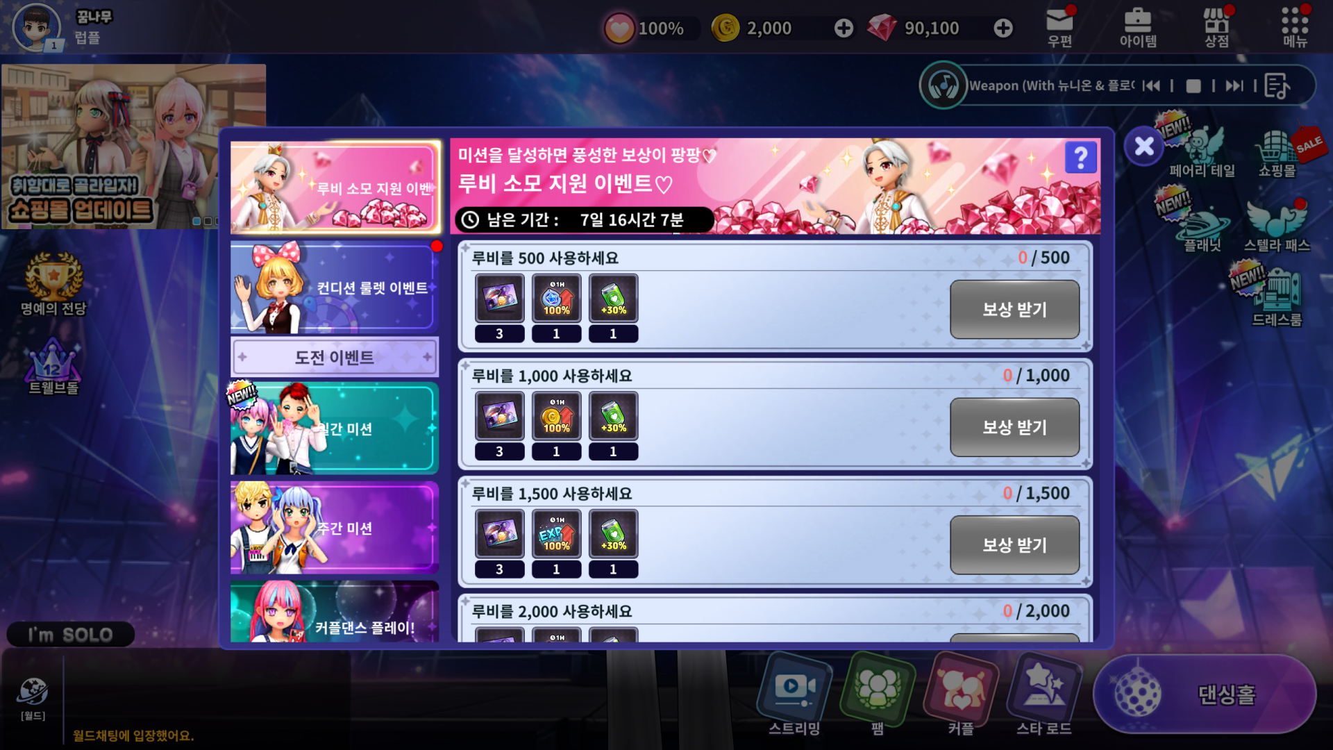 | 8 | 4,000 루비 소모하기 | 플래닛 티켓 3장 | 스타코인 버프 100% 아이템(1시간) 1개 | 컨디션 회복 드링크 50% 1개 |