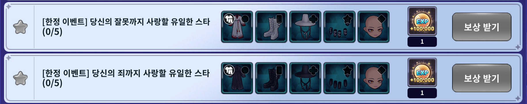 | 저승사자의 위험한 유혹 두루마기 블랙 1개 저승사자의 위험한 유혹 워커 블랙 1개 저승사자의 위험한 유혹 갓 블랙 1개 당신을 부르는 손짓 블랙 1개 당신을 부르는 페이스 1개 | 100,000 EXP 1개 |