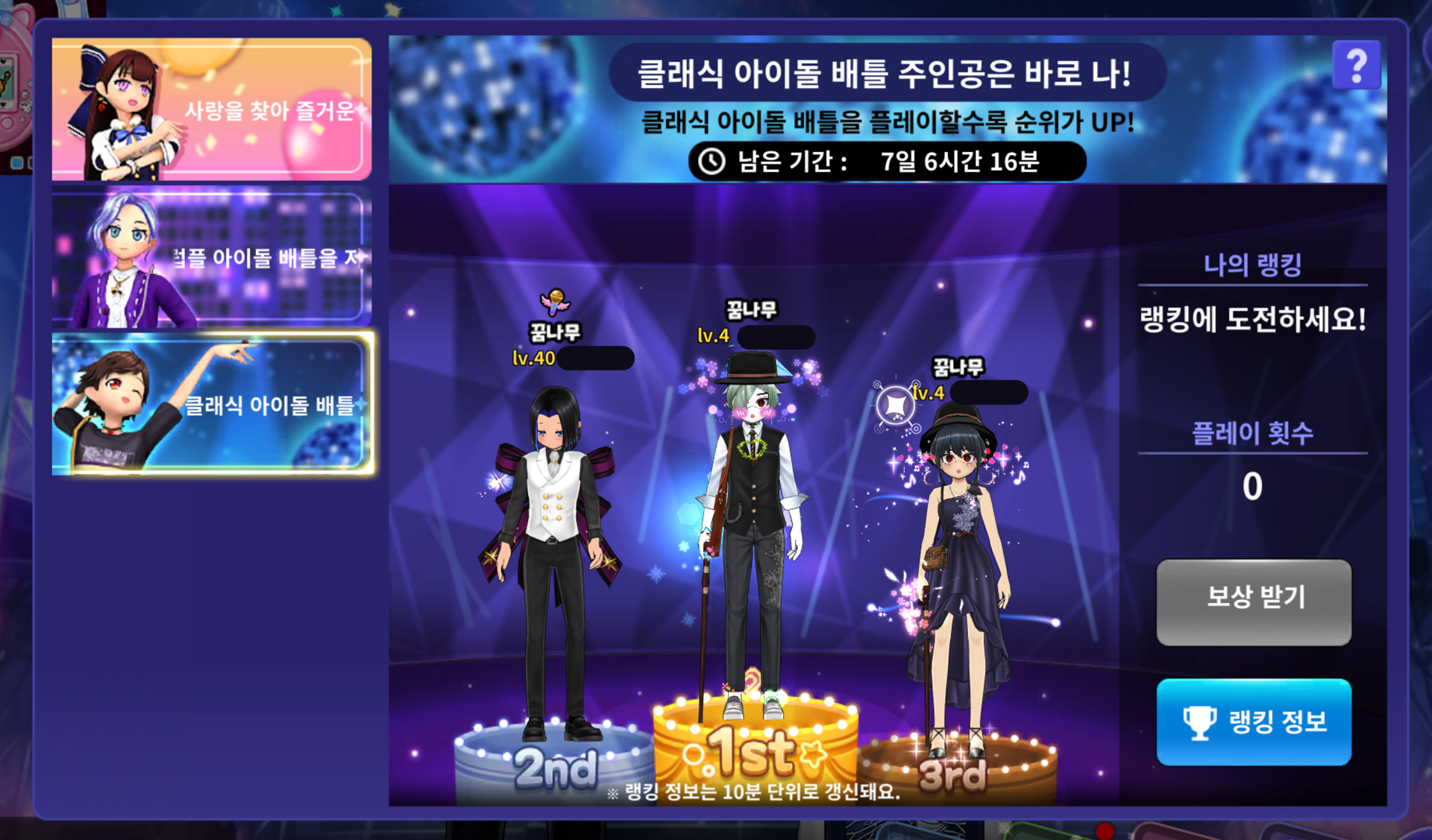 - 이벤트 기간 클래식 아이돌 배틀 플레이 완료 횟수에 따라 랭킹 UP!