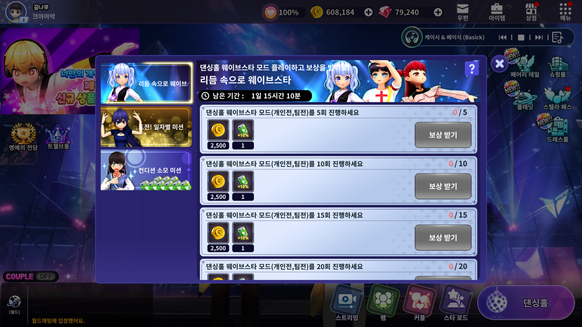 | 댄싱홀 웨이브스타 모드(개인전, 팀전)를 15회 진행하세요 | 골드 2,500 | 컨디션 회복 드링크 10% 1개 |