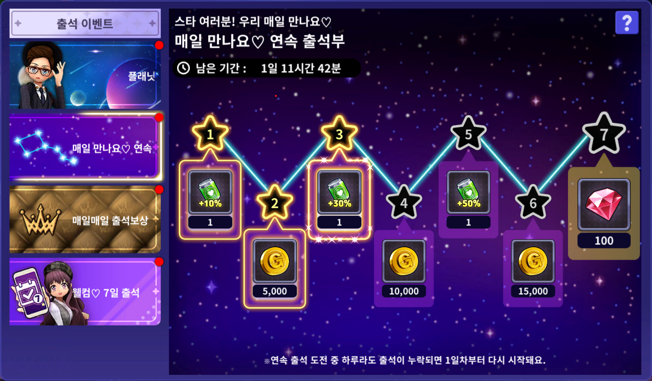 연속 출석에 실패할 경우 1일차부터 다시 출석이 진행됩니다.