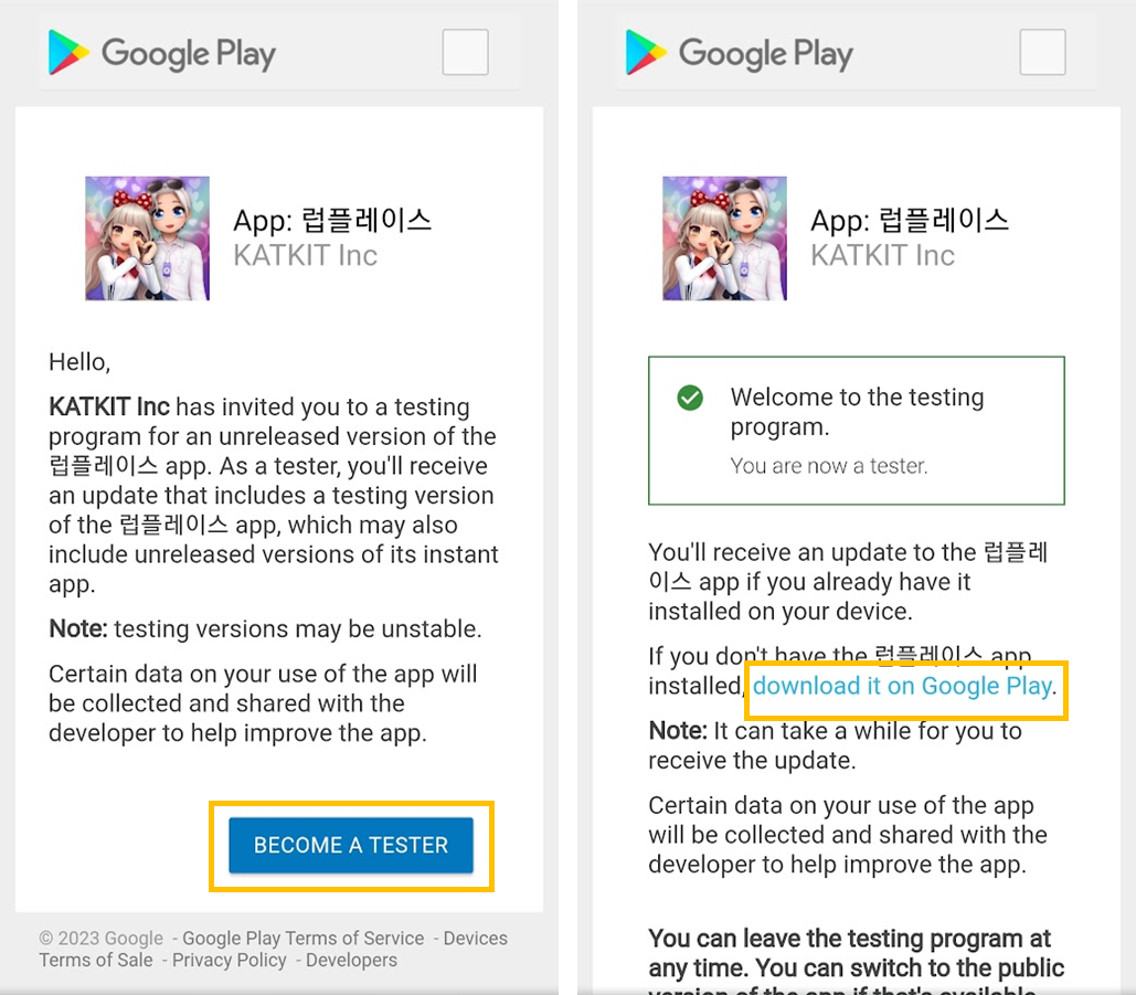 BECOME A TESTER 버튼을 클릭 후 download it Google Play. 버튼을 클릭하면