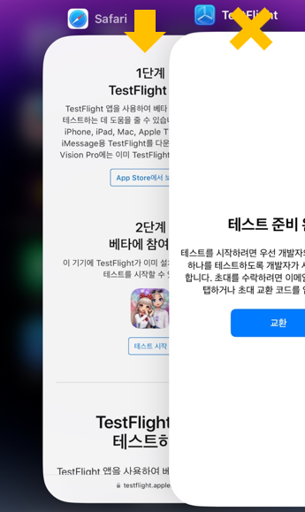 탭을 올려 TestFlight를 종료하시고, [테스트 시작] 버튼이 있는 페이지로 돌아가주시면 됩니다.