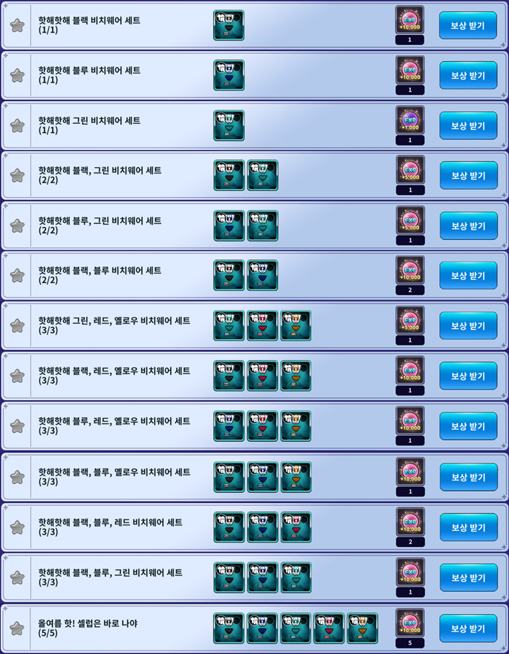 - 핫해핫해 블루 비치웨어 세트 (보상: 10,000 EXP 1개)