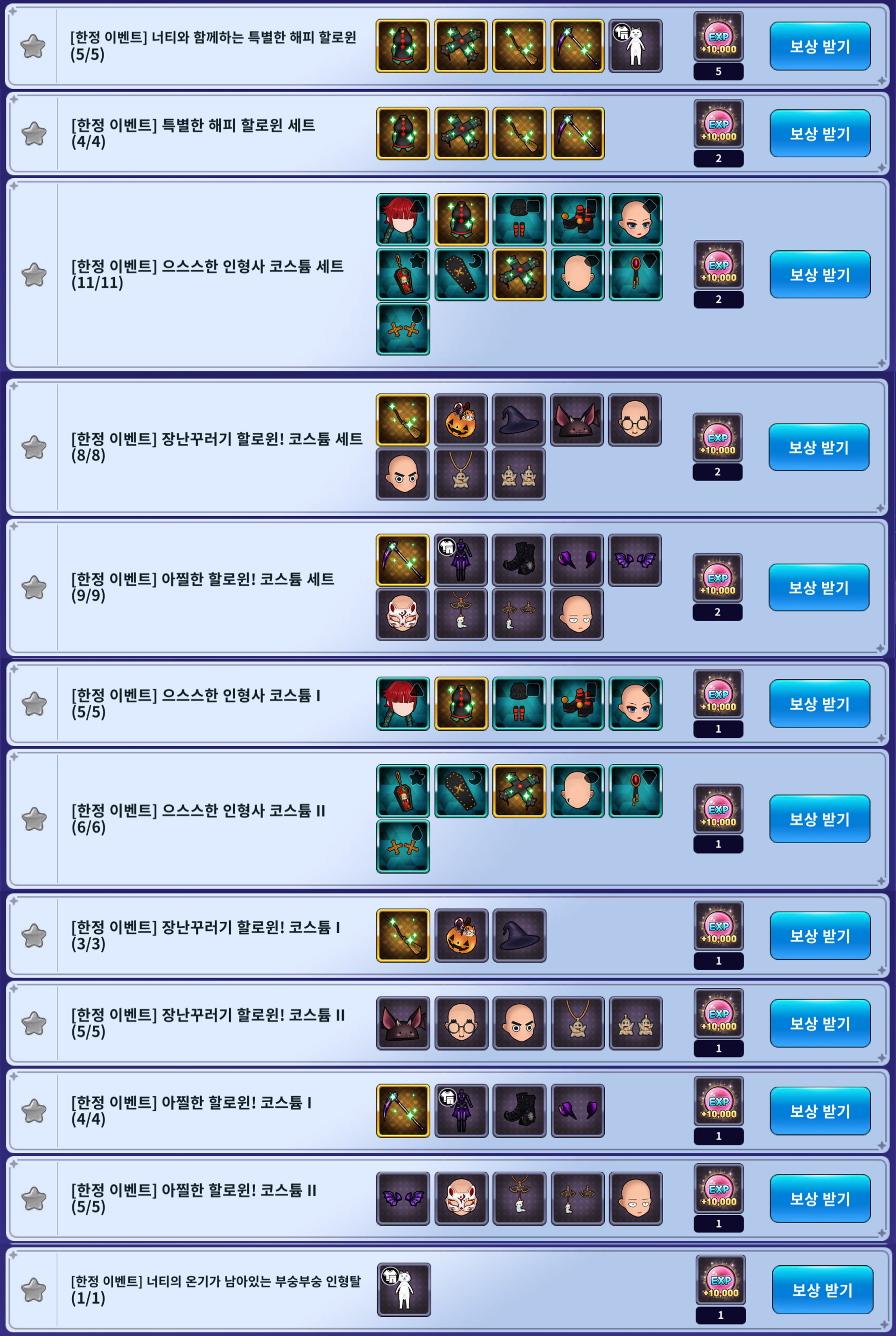 - 특별한 해피 할로윈 세트 (보상: 10,000 EXP 2개)
