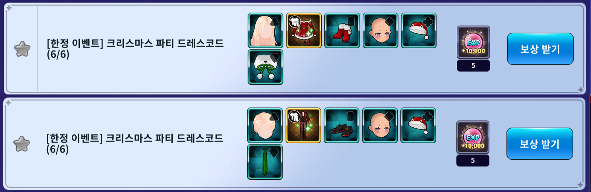 - 크리스마스 파티 드레스코드 (보상: 10,000 EXP 5개)