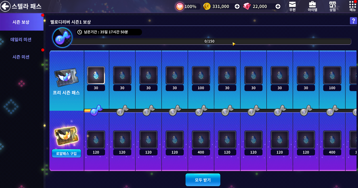 -패스가 판매되는 기간 동안 달성할 수 있는 미션 리스트입니다. (시즌 1회)