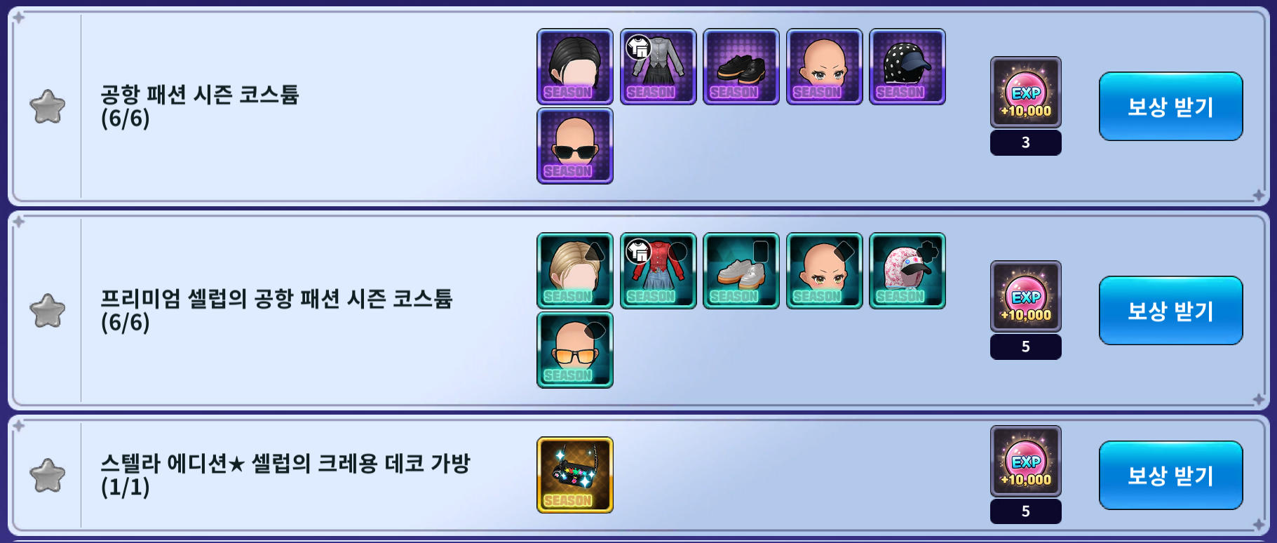 | 22 | 공항 패션 헤어 악세 박스 1개 | 셀럽의 공항 패션 헤어 악세 박스 1개 | 럭셔리 럽스페이스 배지 3,000개 |