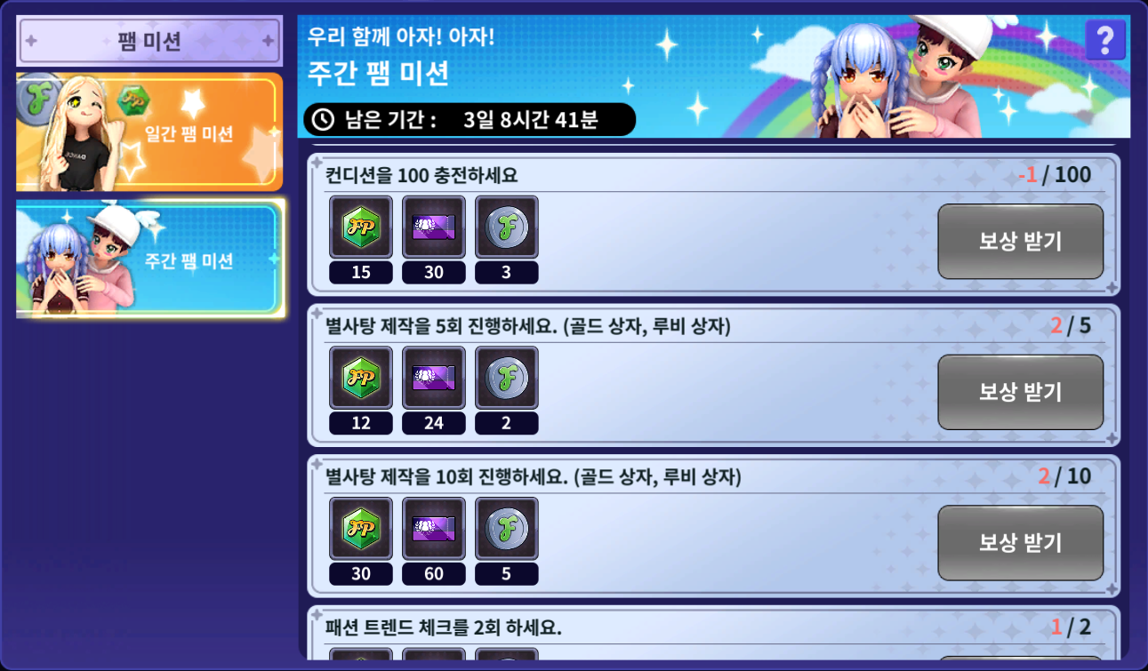 일간/주간 팸 미션 콘텐츠에서 진행 가능한 컨디션 충전 미션의 달성도가