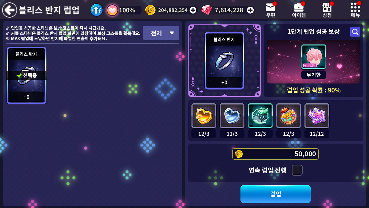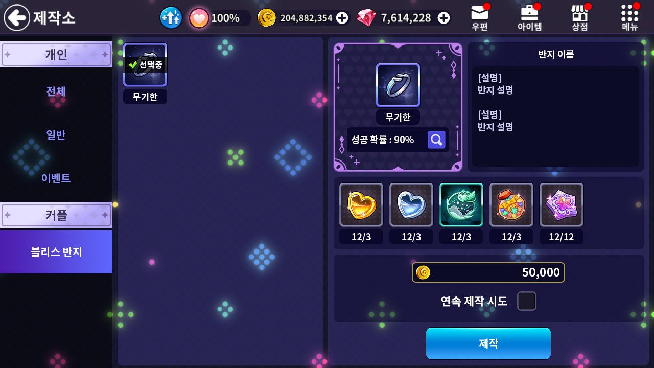 - 블리스 반지는 커플인 스타님들만 제작할 수 있으며, 제작소에서 일정 재화를 소모하여 제작이 가능합니다.