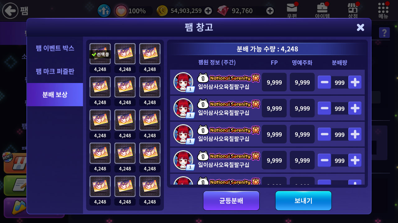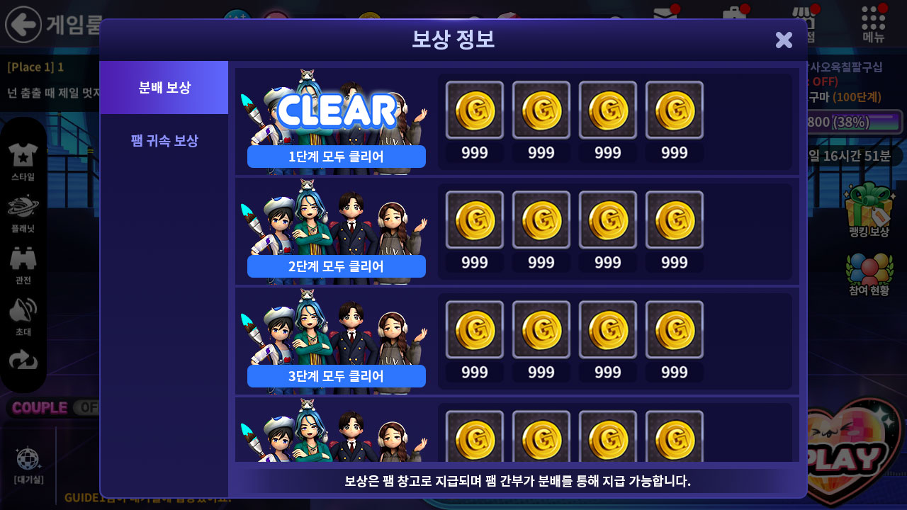 - 각 단계를 클리어할 때마다 보상이 팸 창고로 지급되며, 팸 마스터와 부마스터가 해당 보상을 팸원에게 분배할 수 있습니다.