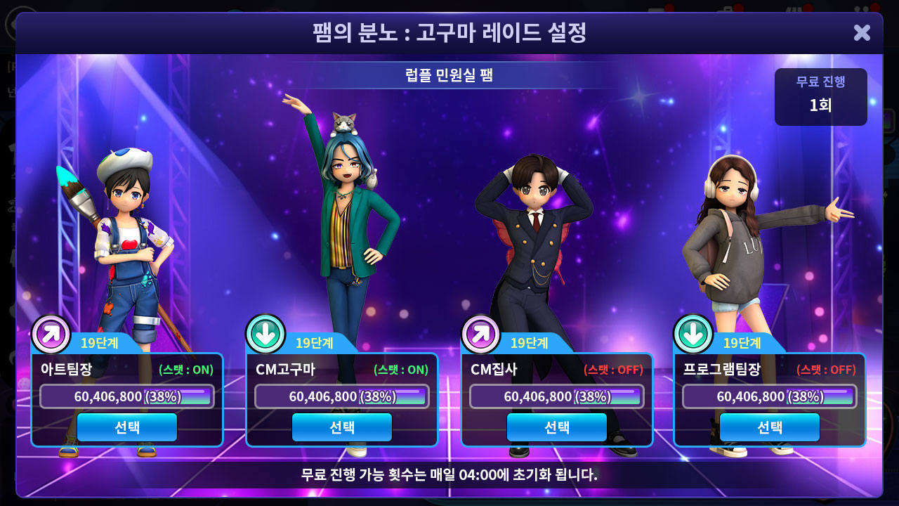 - 럽플, 클래식 모드로 진행 가능하며 4명의 NPC 중 2명은 스탯 ON, 나머지 2명은 스탯 OFF 상태로 구성됩니다.