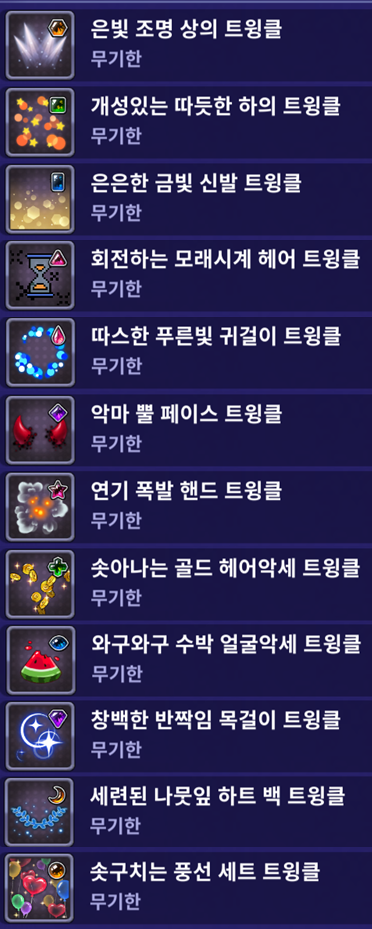 트윙클은 [드레스 룸] - [트윙클 룸]을 통해서 확인 및 장착 가능합니다.