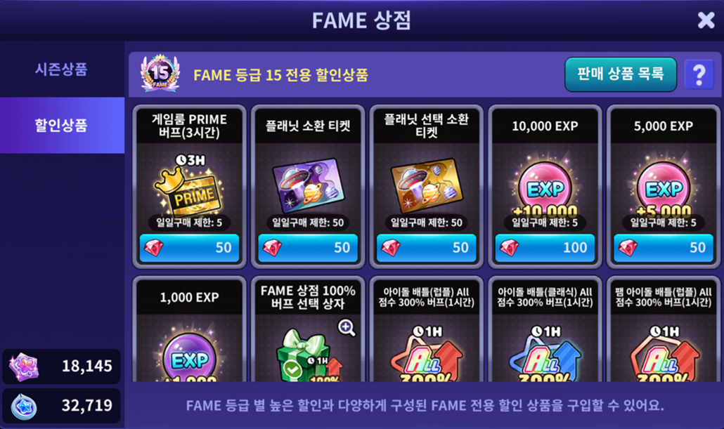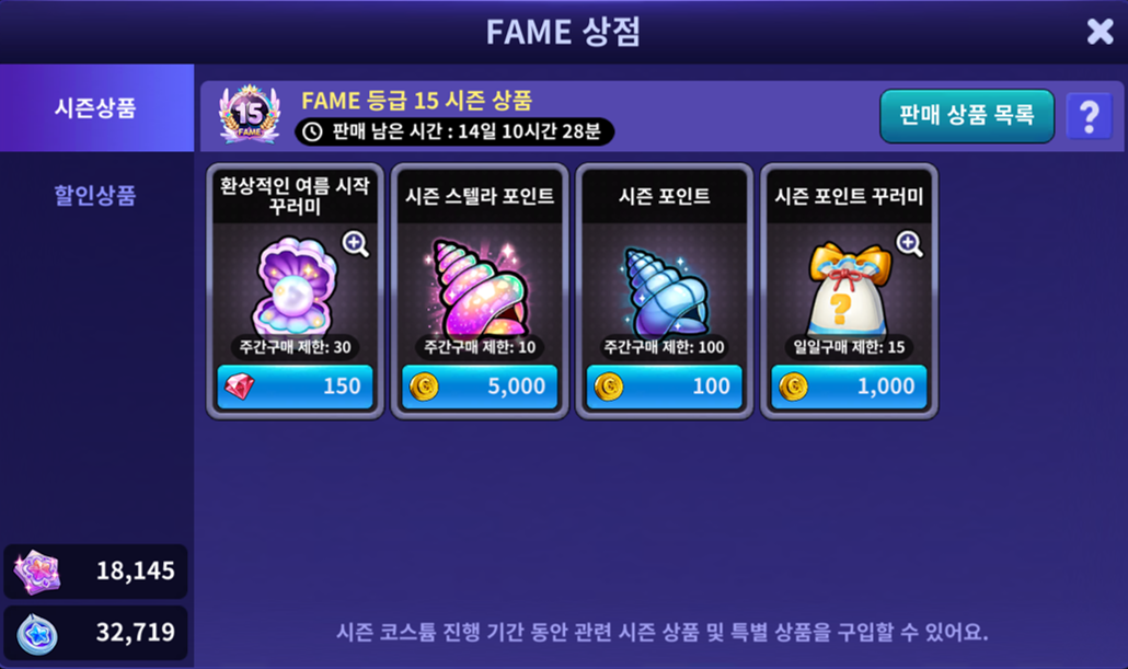 □ FAME 상점의 시즌상품, 할인상품이 새롭게 재구성 되었습니다.