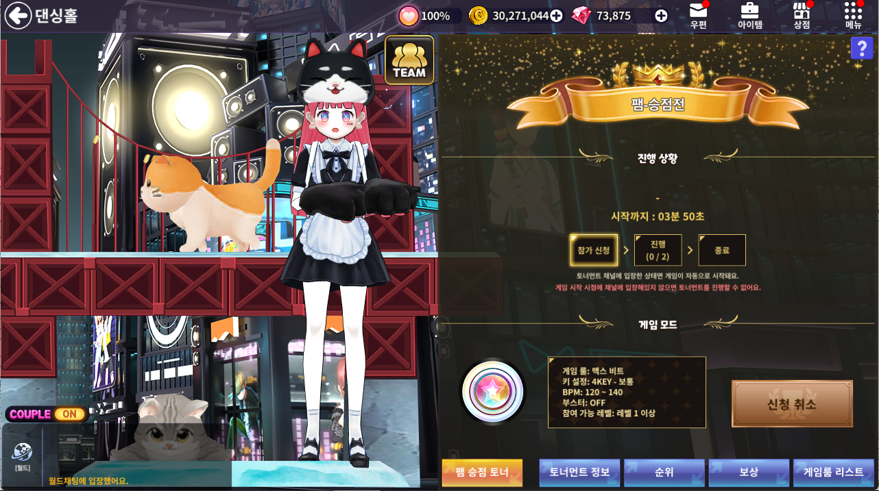 □ 팸 토너먼트가 개최되면 [댄싱홀] - [채널 변경] - [토너먼트 채널]을 선택하여 진입할 수 있습니다.