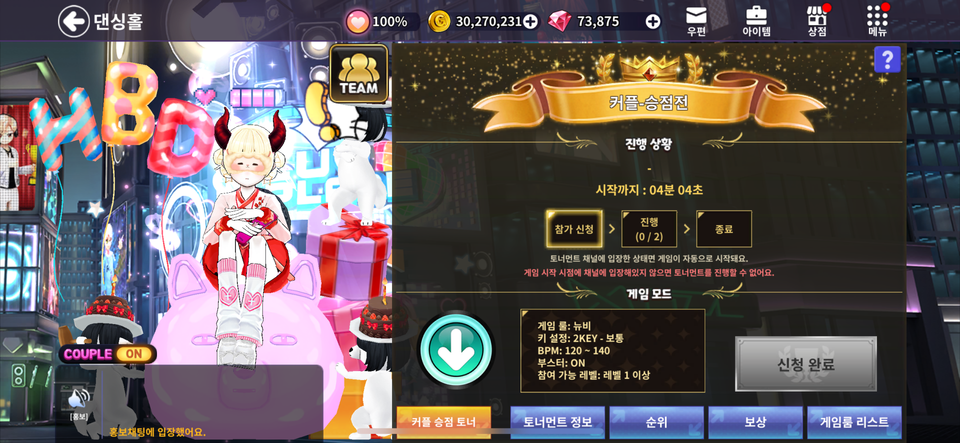 □ 커플 토너먼트가 개최되면 [댄싱홀] - [채널 변경] - [토너먼트 채널]을 선택하여 진입할 수 있습니다.