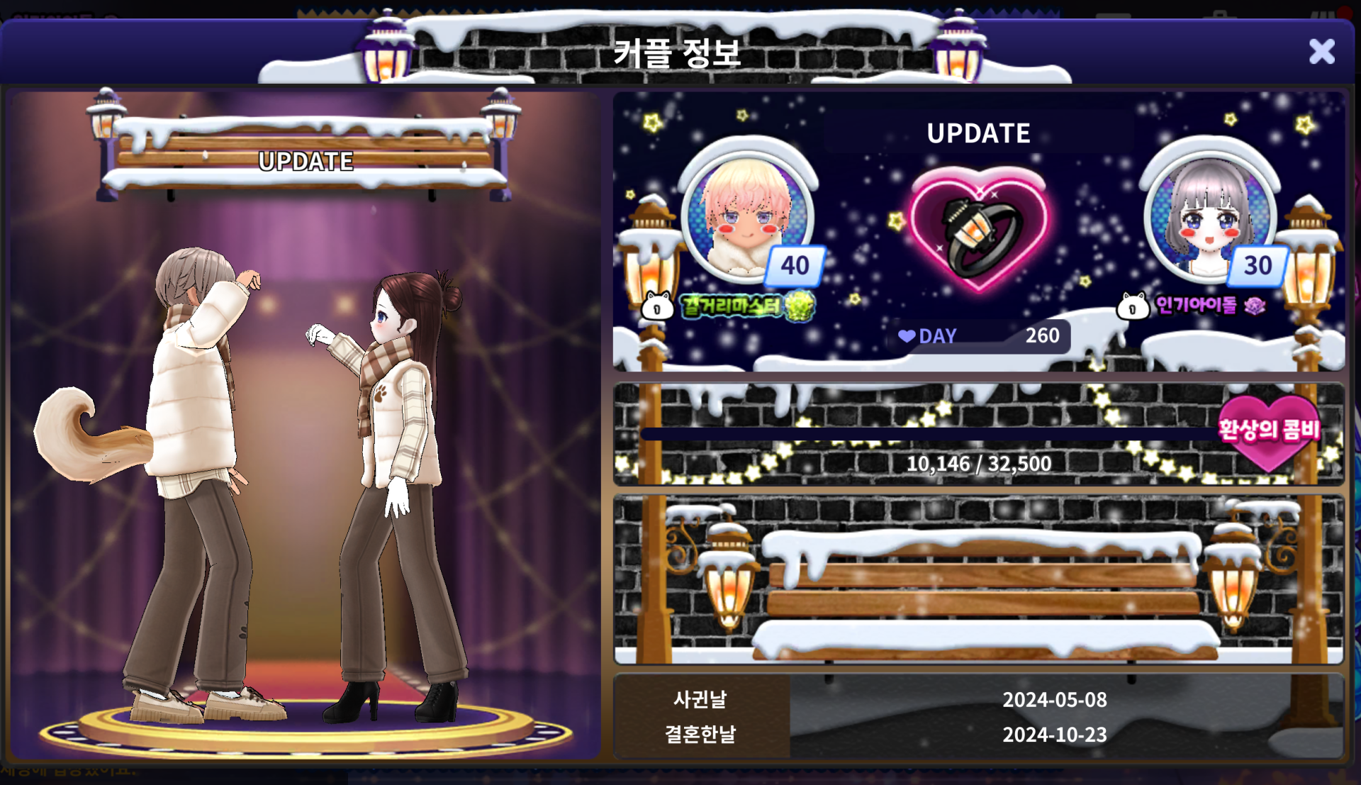 | 신규 커플 배경: 눈 덮힌 돌담길 | 신규 커플 포즈: 두근두근 백 허그 포즈 |