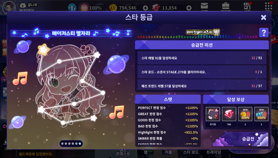 | 등급 이름 | 스타 레벨 | 별자리 레벨 | 패션 레벨 | 럽스페이스 월렛 | 쇼댄서 스테이지 클리어 |