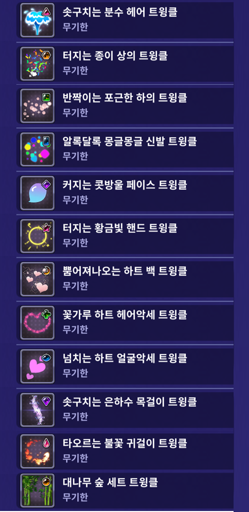 트윙클은 [드레스 룸] - [트윙클 룸]을 통해서 확인 및 장착 가능합니다.